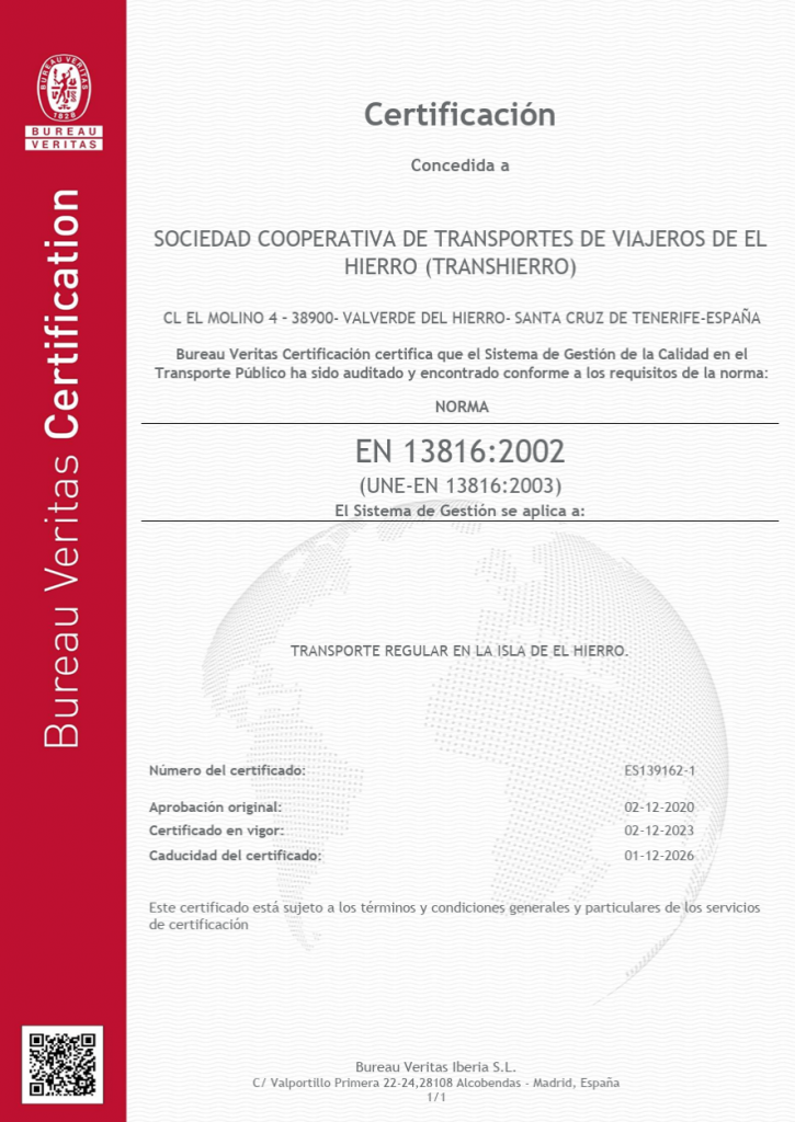 TransHierro cuenta con las certificaciones más exigentes de su Sistema Integrado de Gestión de la Calidad, Medio Ambiente y Seguridad y Salud en el Trabajo aplicado al transporte regular, discrecional y escolar de viajeros, la gestión de taxis y alquiler de coches sin conductor en la isla de El Hierro, certificado bajo las normas ISO 9001, ISO 14001 e ISO 45001, así como la certificación UNE-EN 13816 de Sistema de Gestión de Calidad para Operadores de Transporte de Viajeros, acreditando la aplicación de las mejores prácticas en nuestros procesos.